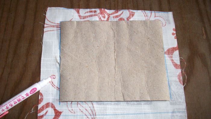 縫いしろを折り曲げて、布用接着剤で芯にまいていきます。